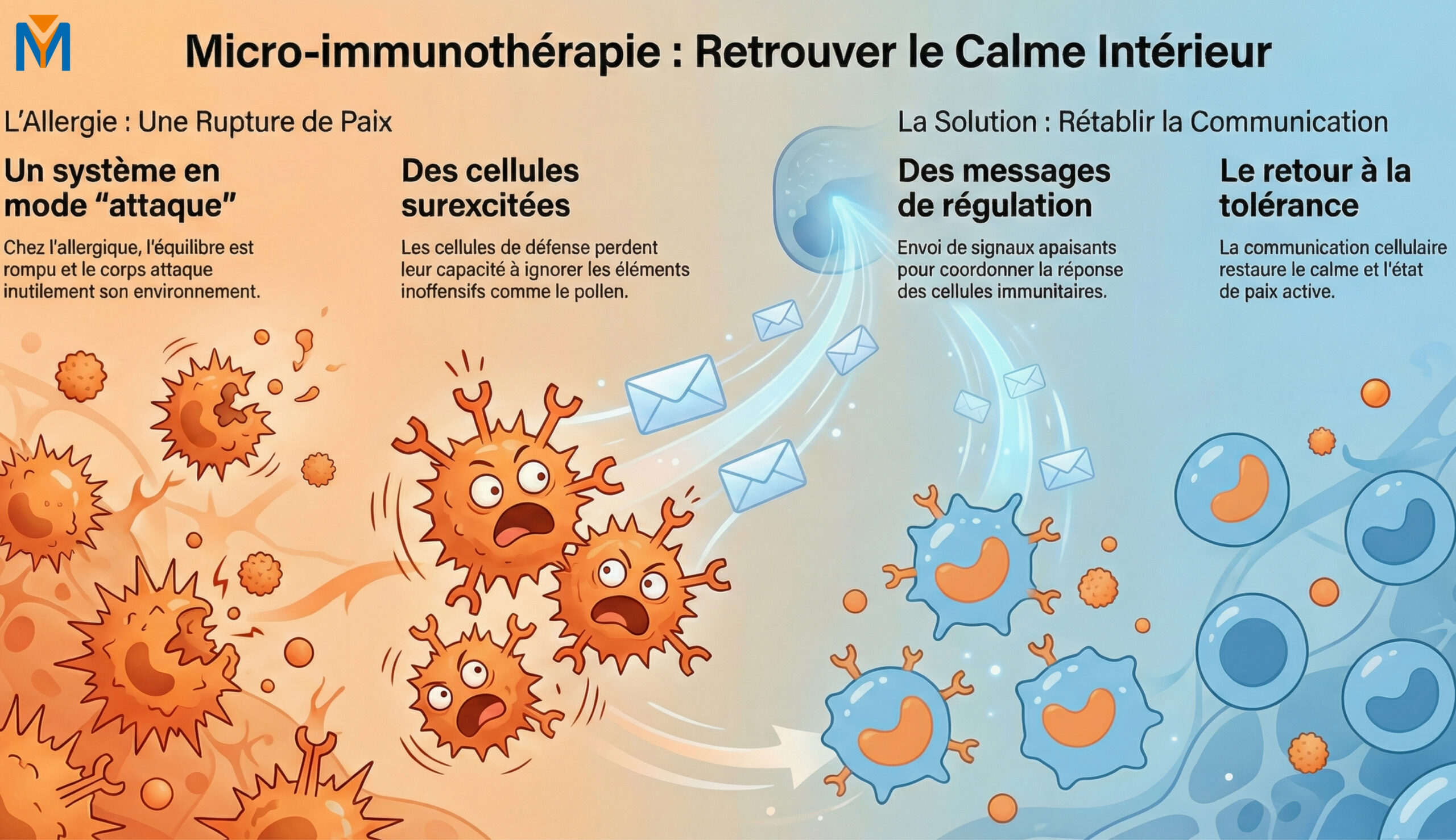 La micro-immunothérapie propose une approche différente. Elle ne cherche pas à bloquer la réaction, mais à "rééduquer" le système immunitaire. En utilisant des messagers naturels du corps (comme les cytokines) préparés à des doses très faibles, elle transmet des informations de régulation aux cellules de défense. L'objectif est de restaurer progressivement la tolérance immunitaire, pour que le corps apprenne à nouveau à ignorer ce qui ne le menace pas.