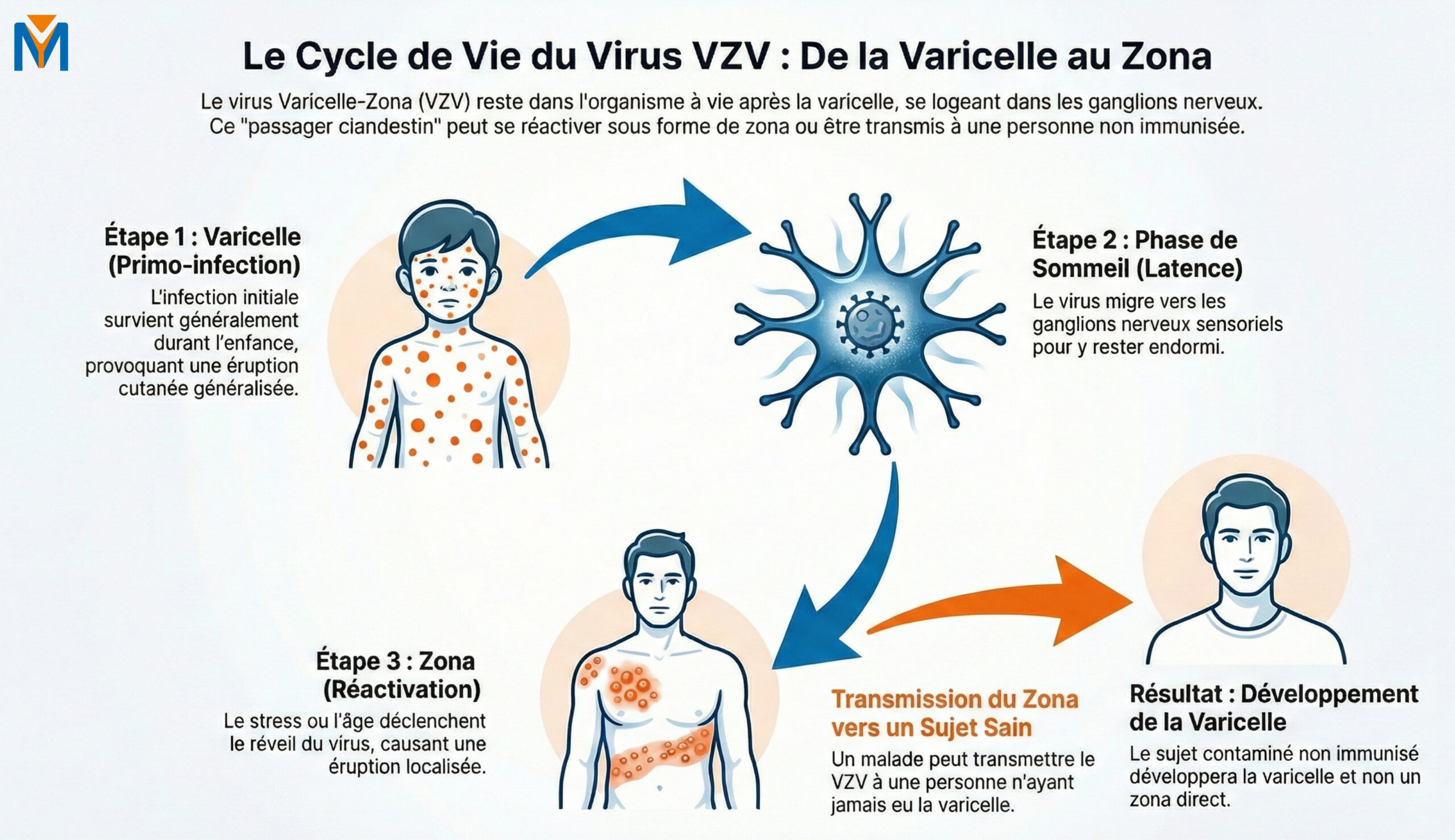 Pour comprendre le zona, il faut remonter à l'enfance. Le responsable est le virus Varicelle-Zona (VZV), membre de la famille des herpès-virus. Une fois que vous avez guéri de la varicelle, le virus ne quitte jamais votre organisme. Il migre le long des fibres nerveuses pour s'installer durablement dans les ganglions sensoriels, à la racine de la moelle épinière.