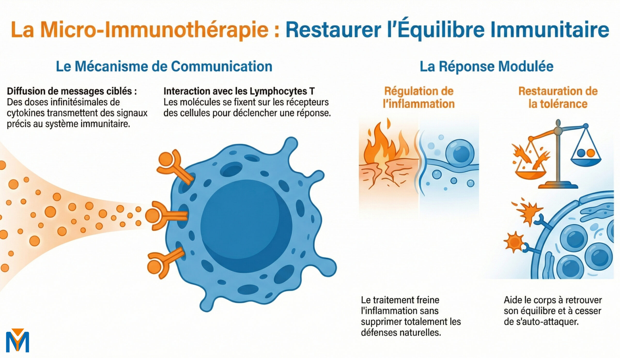 C'est ici qu'intervient la micro-immunothérapie. Cette approche utilise des messagers naturels du système immunitaire (comme les cytokines) à des doses très faibles. L'objectif est de redonner au corps les "bonnes instructions" pour qu'il retrouve son équilibre de manière autonome. Elle agit comme un médiateur qui aide vos cellules à communiquer à nouveau harmonieusement, facilitant ainsi votre chemin vers un mieux-être global.