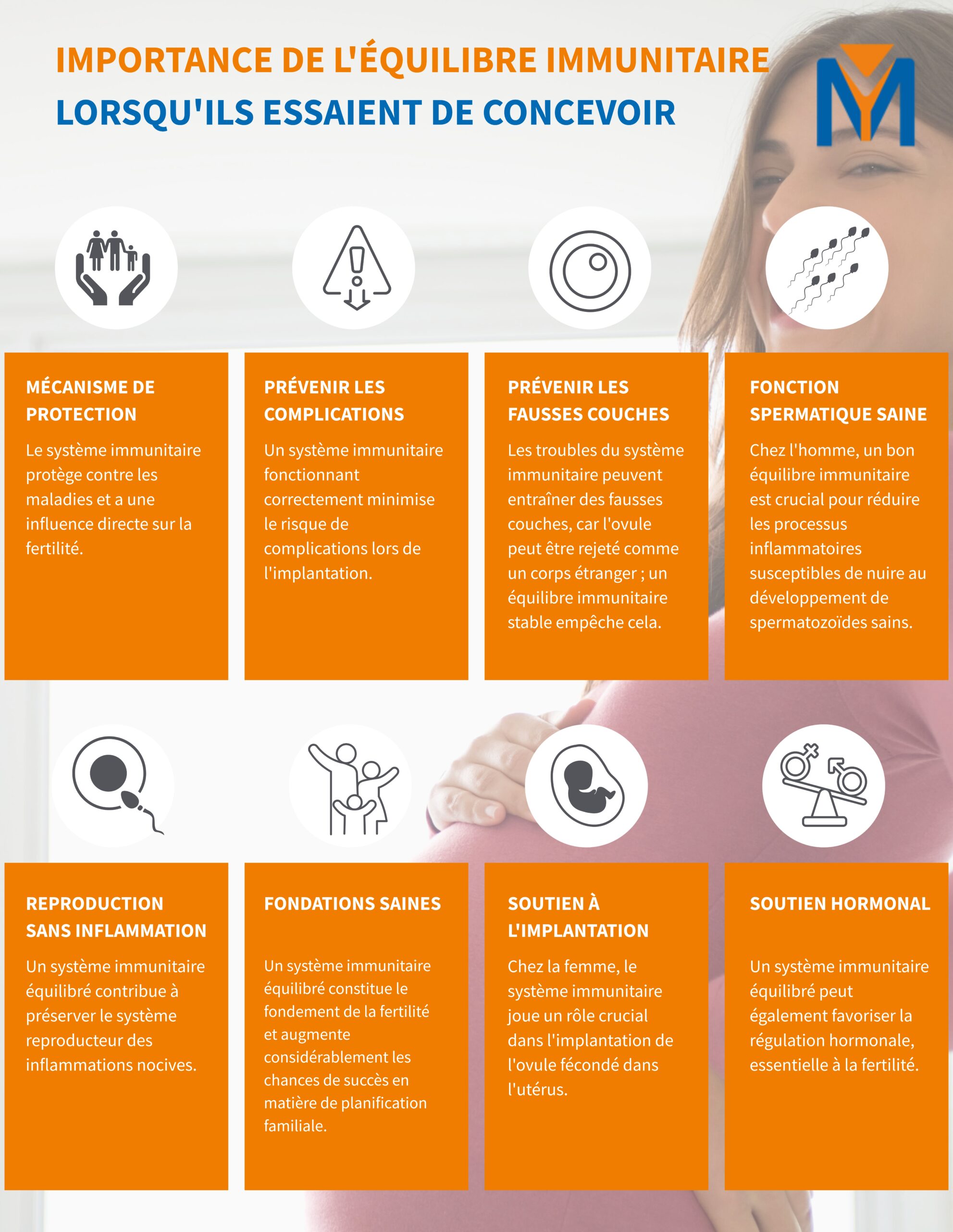Connaissez-vous déjà le véritable atout de la planification familiale : l'équilibre immunitaire ? Notre système immunitaire nous protège généralement des maladies et a également une influence significative sur la fertilité. Un bon équilibre immunitaire peut constituer un ancrage stable, préservant ainsi les chances de réussite d'une grossesse. Le système immunitaire est particulièrement important pour les femmes, car il joue un rôle crucial dans l'implantation de l'ovule fécondé dans l'utérus. Un système immunitaire performant garantit le bon déroulement de ces processus et minimise les risques de complications. À l'inverse, des troubles du système immunitaire peuvent entraîner des fausses couches à répétition ou des problèmes d'implantation, car l'organisme peut reconnaître l'ovule fécondé comme un corps étranger et le rejeter.
